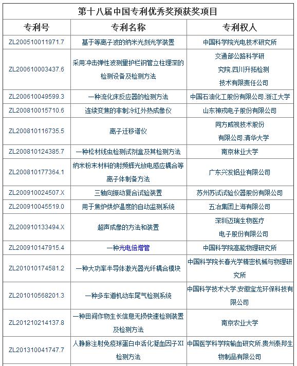 第十八屆中國專利獎評審儀器相關項目入選介紹