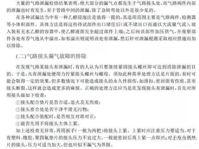 此外,氣路閥件內(nèi)部松動(dòng)、脫落或有污物,也常導(dǎo)致漏氣;一般氣路中間漏氣問(wèn)題較少,偶爾也有管路折斷漏氣。