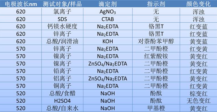 除水硬度外,光度滴定儀還可應(yīng)用于大量其他的滴定應(yīng)用,比如Ni離子、Zn離子的分析等,由于沒有合適的指示電極,這些離子往往無法使用電位滴定儀進(jìn)行測試,而光度滴定可以很好地實(shí)現(xiàn)類似離子的分析。