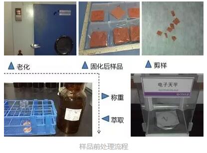 按照推薦性國家標準《合成材料跑道面層》對送檢試樣的要求,樣品應(yīng)在固化14天后進行測試.因事情緊急,為更客觀地檢測操場情況,將樣品放入烤箱加速其固化,剪樣、稱重、萃取。