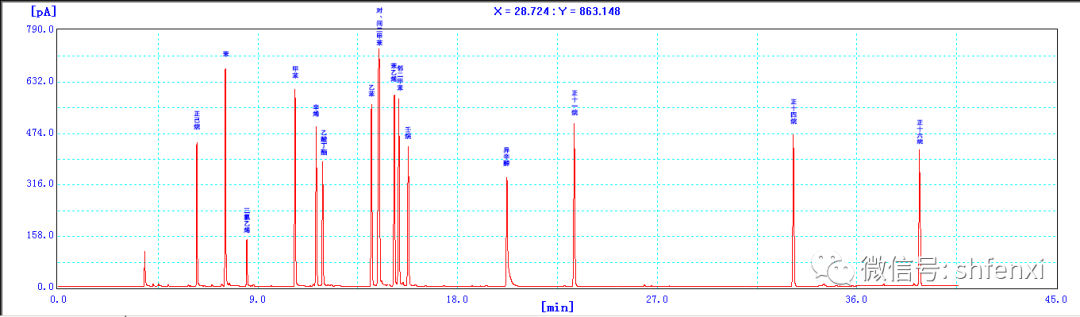 計(jì)算應(yīng)包含正己烷和正十六烷之間所有的已知峰和未知峰,對(duì)未識(shí)別峰以甲苯計(jì)算含量。