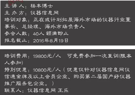 為了幫助優(yōu)秀的科學儀器產品和企業(yè)走出國門,開拓國際市場,儀器信息網特邀具有豐富海外市場開拓經驗的楊豐博士進行《中國科學儀器企業(yè)如何拓展海外市場》主題培訓,系統(tǒng)的從戰(zhàn)略及戰(zhàn)術層面為參會企業(yè)答疑解惑。
