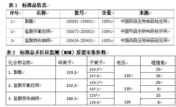 將標(biāo)準(zhǔn)品分別配制成1mg/mL的酚酞,鹽酸芬氟拉明,鹽酸西布曲明標(biāo)準(zhǔn)儲(chǔ)備液,分別吸取標(biāo)準(zhǔn)儲(chǔ)備溶液進(jìn)行稀釋?zhuān)玫?00ng/mL,80ng/mL,50ng/mL,20ng/mL,10ng/mL,5ng/mL的標(biāo)準(zhǔn)工作溶液。